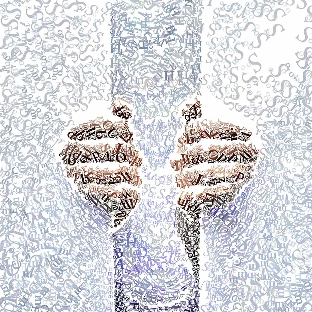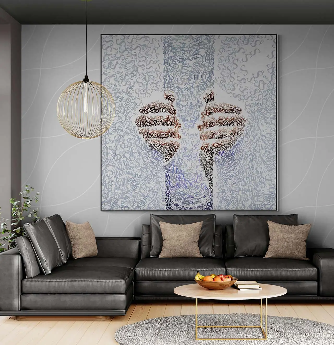 I apply colored letters one by one, creating surfaces dense with meaning and layered narratives.