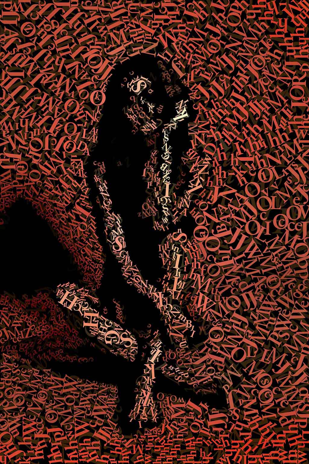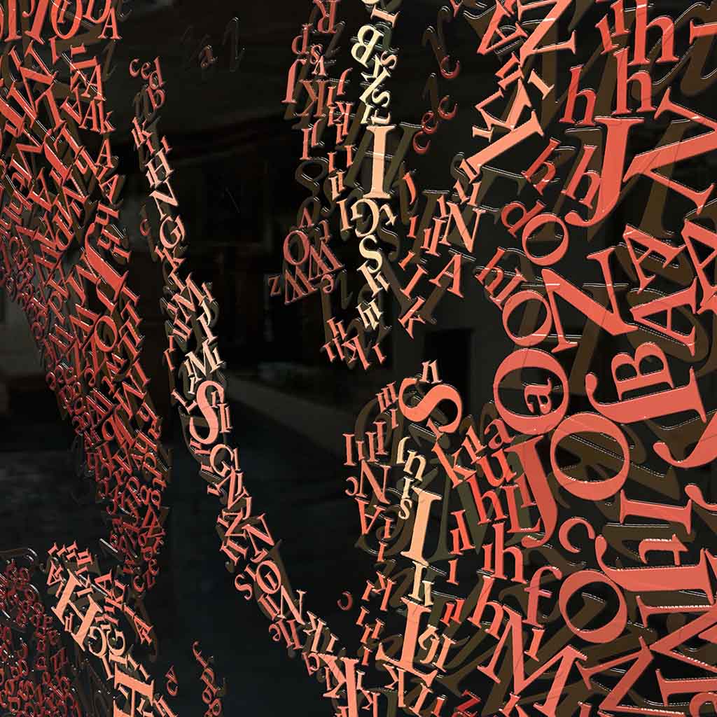 I apply colored letters one by one, creating surfaces dense with meaning and layered narratives.