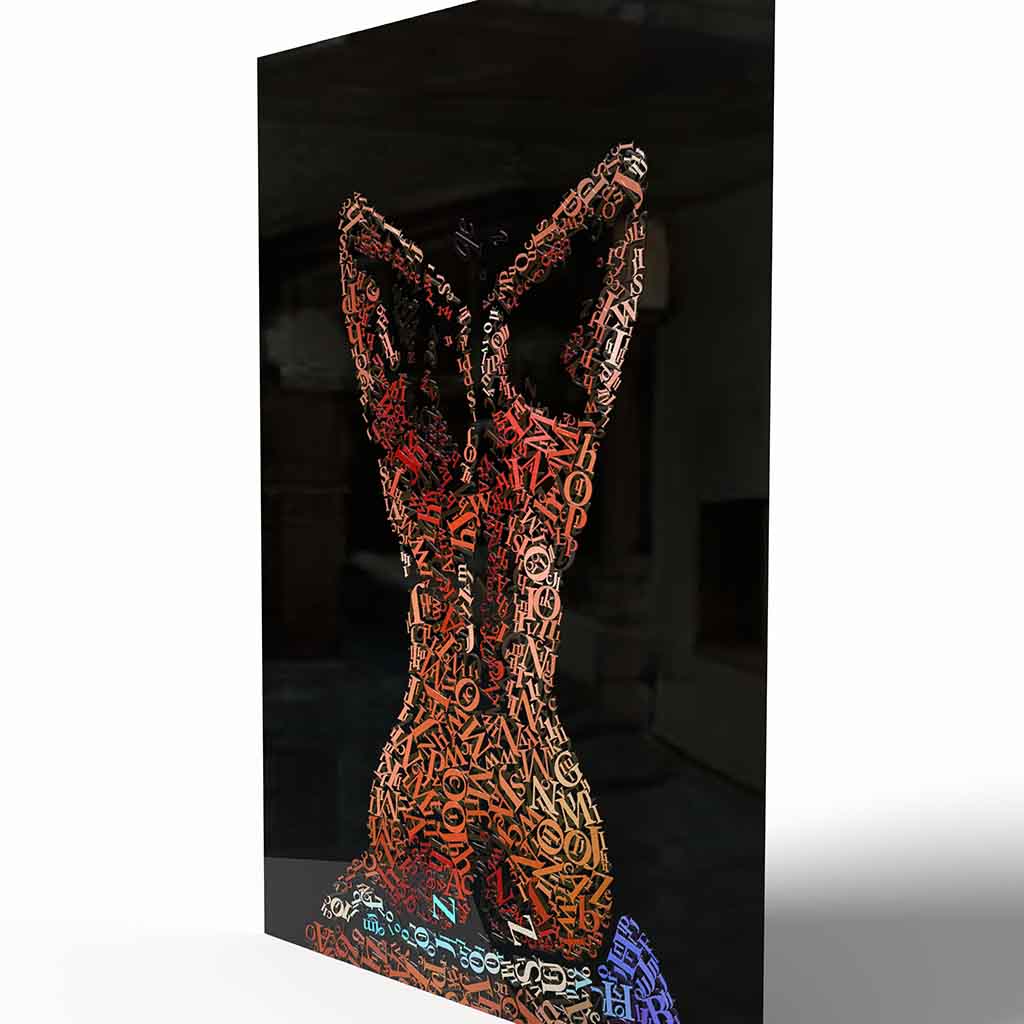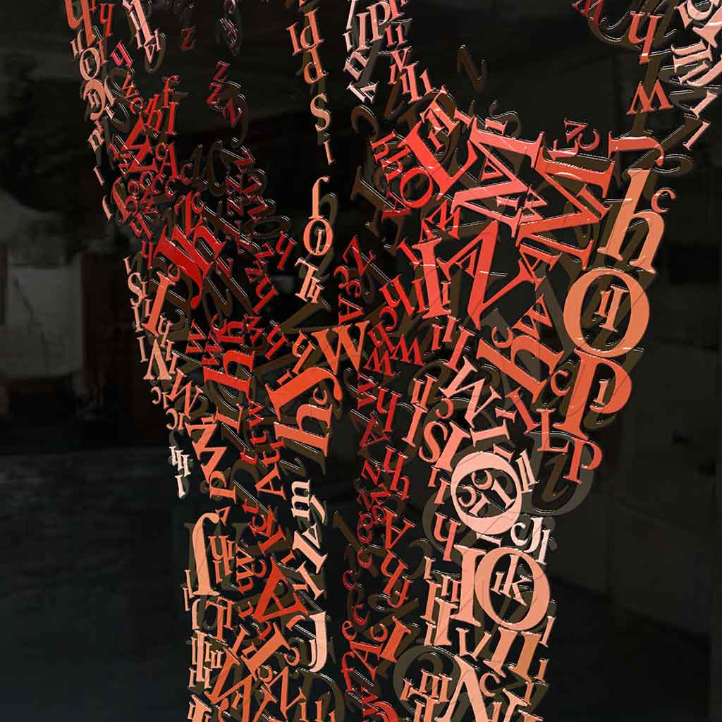 I apply colored letters one by one, creating surfaces dense with meaning and layered narratives.